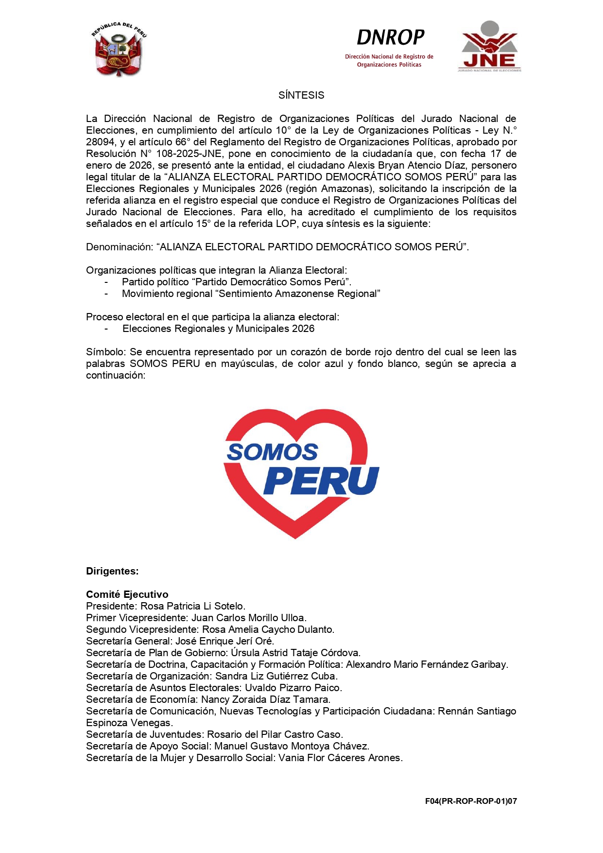 Síntesis Alianza Electoral Movimiento Político Sentimiento Amazonense Regional